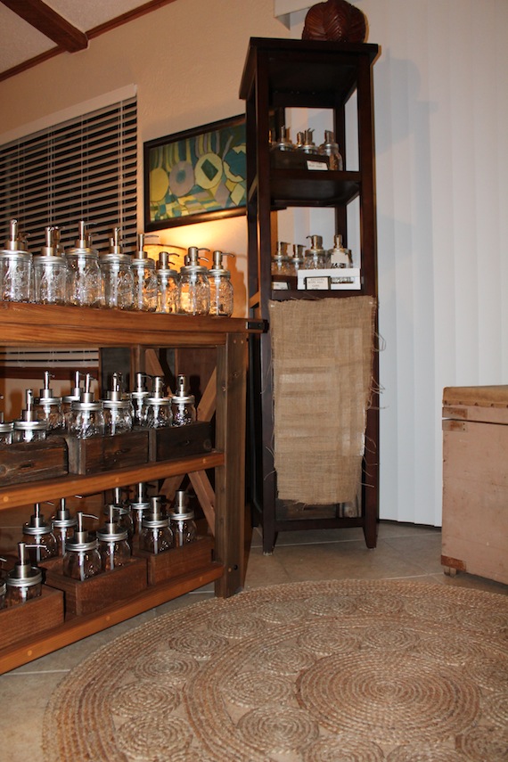 Our little bistro table has a sample dispenser with lotion, a little piece of art and our business cards. |
